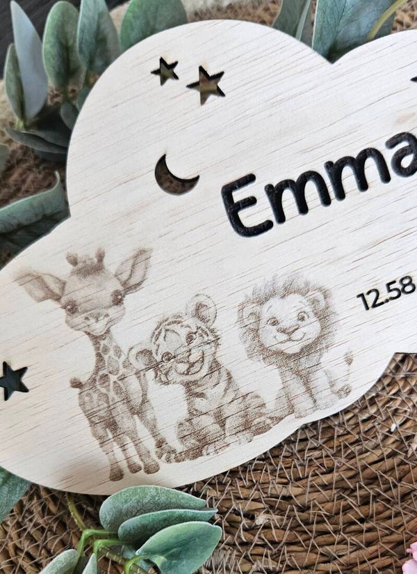 Muurplaat Safari Wolkje – Gepersonaliseerd met Naam & Geboortegegevens